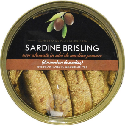 Ingrediente: Sprattus sprattus (70%) (Zona de pescuit: Marea Baltica FAO27 III.d); ulei masline pomace (din samburi de masline) (29%); sare (1%).